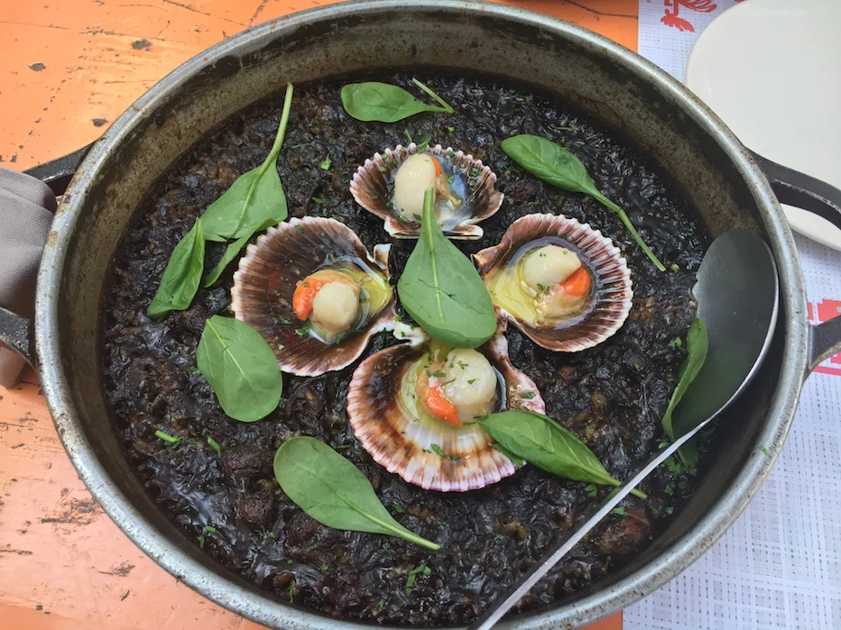 The black rice paella at Gallito is topped with baby cuttlefish and scallops.